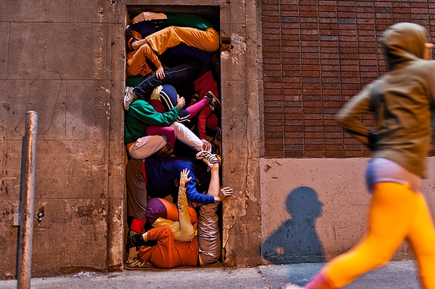 As you can see, the performers stood on top of each other and got in all kinds of unusual positions (even wrapping themselves around a fire hydrant) to achieve this colorful, artistic look. The purpose of this presentation was to explore the relationship between body, space and architecture.