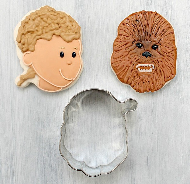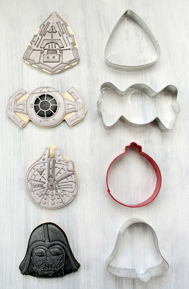 For example, in the picture below, you’ll see that she took a regular Santa Claus cookie cutter and created an Anakin and a Chewbacca cookie. She used a spider cookie cutter to make Princess Leia and Yoda cookies. A standard Christmas ornament cookie cutter made the perfect form for a Millennium Falcon. You can read all about the process and see many more pictures by going to Star Wars Cookies Using Holiday Cutters. Girl, you are brilliant! I love these!