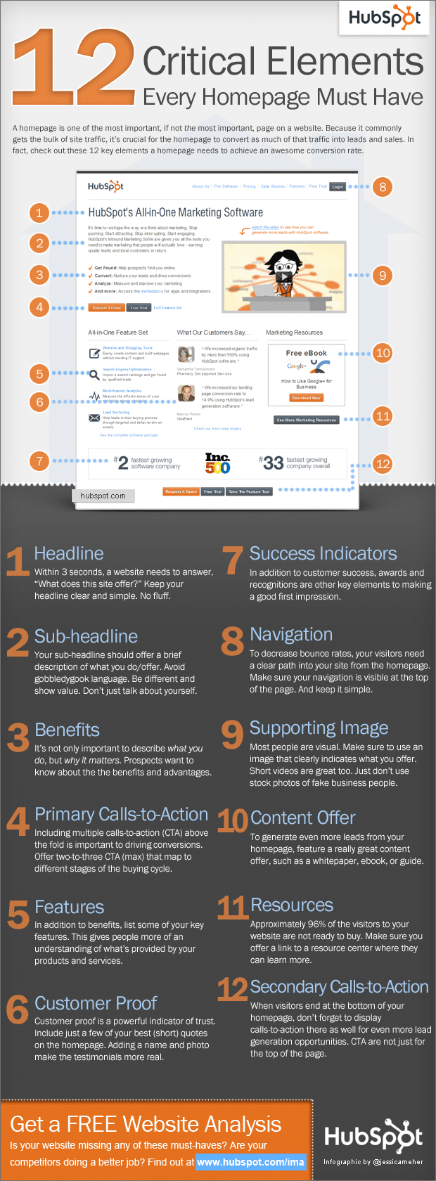 There are of course many different ways to determine what the critical elements of a website are, but according to HubSpot‘s infographic called 12 Critical Elements Every Homepage Must Have, we are treated to some of the obvious ones. I call them obvious, but for some people, they might not come across that way.