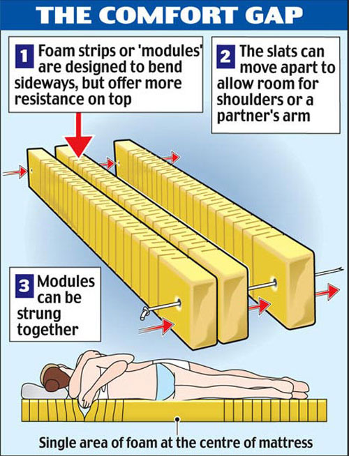 The Cuddle Mattress is a modular mattress that is designed to give you places to stick your arms, shoulders, feet and other body parts when you are trying to embrace the one you love. There are slats on the upper and lower portion of this mattress where you can put your body when you need a little more flexibility for cuddling.