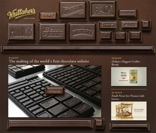 I’ll give you a brief history of what has transpired in the world of chocolate websites over the past few months. In April, Whittaker’s launched the world’s first website made out of chocolate. They created each of the buttons on the site to look like pieces of their delicious chocolate bars. Andrew and Brian Whittaker spared no expense in time or details. The site took countless hours to create, and everything down to the chocolate breaking sound bytes was considered. They created the entire website from chocolate then carefully photographed everything to complete the site. You can experience it at Whittaker’s.