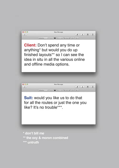 Mark Shanley and Paddy Treacy of Mark and Paddy decided to take their design feedback and create some rather hilarious posters out of them. They call the collection Sharp Suits. A couple grew into several, and before they knew it, they had amassed 72 insane posters that will make your head start spinning. Some people just don’t know what design is, while others have such vague descriptions that you start wondering if they are high or just clueless. Have a look at this incredibly interesting design feedback poster series, and tell me you didn’t get a good laugh after checking them out. Design feedback like this is what you want to show on your wall when your new customers dodge over to start the collaboration. That way, you will ensure that their design feedback is not as out there as your previous client, or maybe that is too much for me to promise.