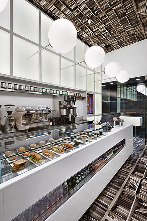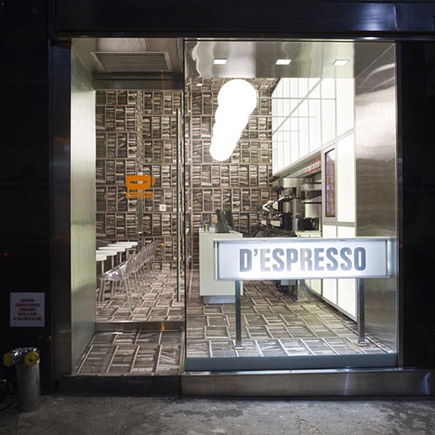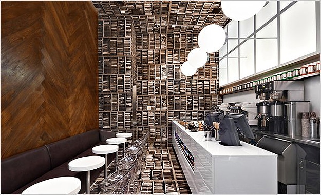 The owner, Eugene Kagansky, decided to have fun with the 500 square feet that he had on Madison Avenue and 42nd Street. He wanted to create a memorable, unusual, creative place for people to grab their morning and afternoon coffee. He gave the designers at Nema Workshop a budget of $500,000 (for only 500 square feet!) and asked them to create a library inspired sideways coffee shop. The designers took pictures at the library and printed them on glazed tiles, which cover the ceiling, wall and floor. It all looks like flip-flopped library shelves.