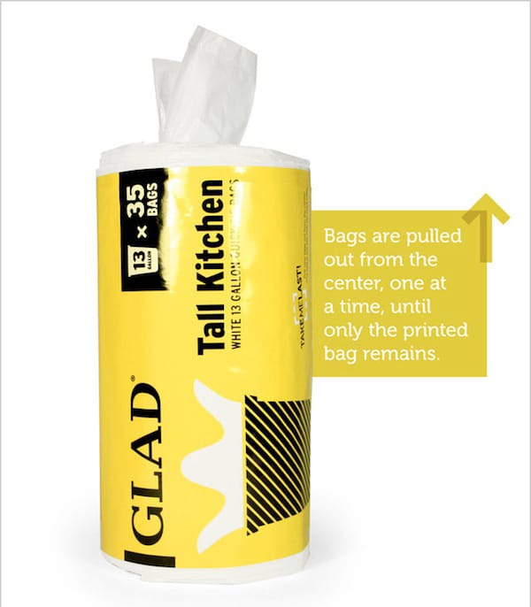 In his product package designs, the packaging itself is incorporated into the product. When the product is used, the package gets “used up” with it. In many cases, the branding is printed directly on the product in soluble ink. In the case of the trash bags below, the entire roll of trash bags is wrapped in one of the bags itself, so when you get to the last bag on the roll, you use the package, if that make sense.