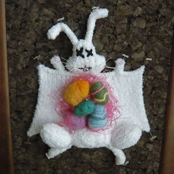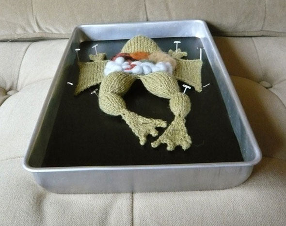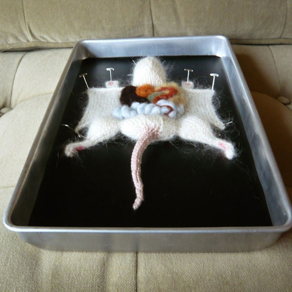 Maybe that is why I was so drawn to this knitted art. Now this is the kind of dissection I think is fun! Through the art of knitting, CraftyHedgehog dissects frogs, rats, fetal pigs, bunnies and alligators. These are cute and creative.