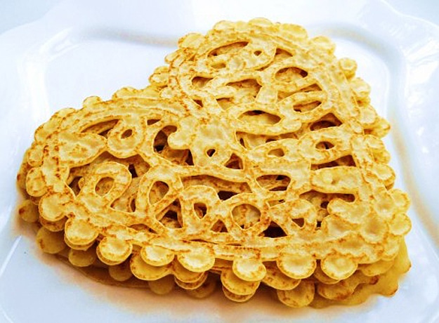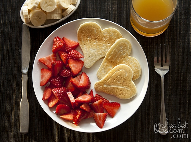 While it might not be very easy to create designs like that on a sleepy Saturday morning, there are still other ways we can make cool pancake designs for a special breakfast in bed. All we need is a little squeeze bottle, some batter, and our wild imaginations! Oh, a little strawberry jam to make the hearts red at the end might be nice too.