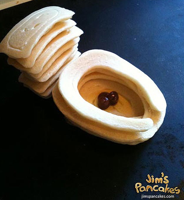 Those are all a little too sophisticated for you? Then how about a toilet pancake design? It comes complete with… um… a chocolate surprise inside! nom nom