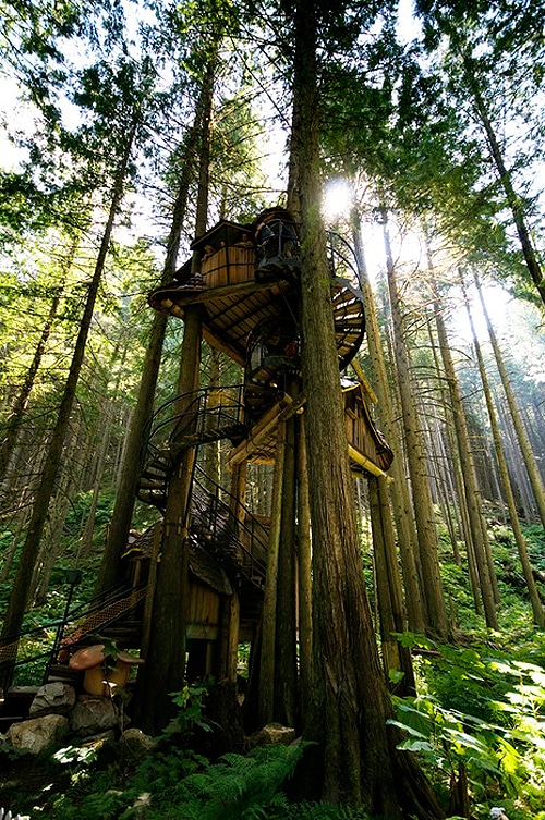 Although I’ve never had the pleasure of building a treehouse of my own, I think it would be like building a regular house, only a lot more fun. I would think very carefully about every aspect of the design including the staircase, the lighting, the windows and the access (only people with the secret password would be allowed in). If you built one, would you want it high in a tree or closer to the ground? Would you want it near water in a secluded forest or in your backyard? Here are ten treehouses from around the world that I wanted to share with you. Some are fabulously built treehouses, and some are simply inspiring pictures of treehouses taken by very talented photographers. Either way, I hope they take you back to your childhood like they did for me.