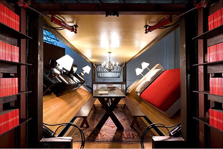 This is how it works…when someone pushes the button; it uses hydraulic power to open the shipping crate completely up. The process takes about 90 seconds (and I bet it’s loud). Once it’s unfolded, the person living in it will enjoy a cozy bed, a couch, a dining table, a bathroom, a library and all the fixins’ that go along with these things like light fixtures, a rug and rich colors which give it all an elegant look. To make it even better, everything inside the home was created from recycled or recyclable materials.