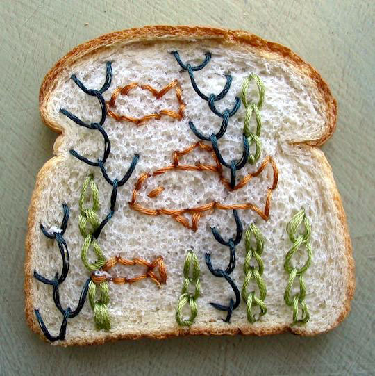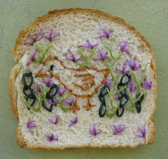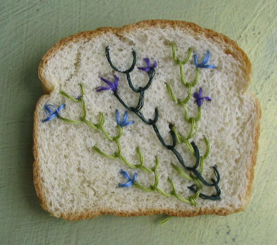Yep, you read that right. Catherine McEver embroiders bread, Wonder bread to be exact. She uses colored floss to embroider scenes from nature onto the surface of the bread.
