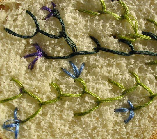 Yep, you read that right. Catherine McEver embroiders bread, Wonder bread to be exact. She uses colored floss to embroider scenes from nature onto the surface of the bread.