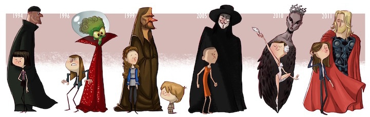 These adorable comic illustrations that show the timelines for 8 different actors and movie characters will definitely bring a smile to your face today. They are done in classic cartoon style with a sprinkle of caricature added. Pop culture fans will love this collection which has many more than 8 actors and characters in it. I just shared my favorite 8 with you for this article. The best one is definitely Biff from Back to the Future, and seeing these drawings makes me want to watch that movie again today.