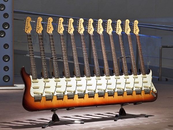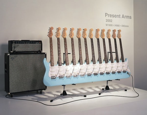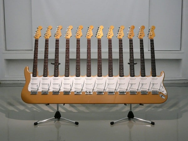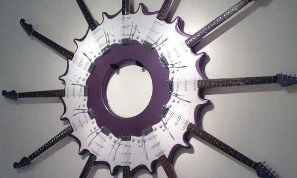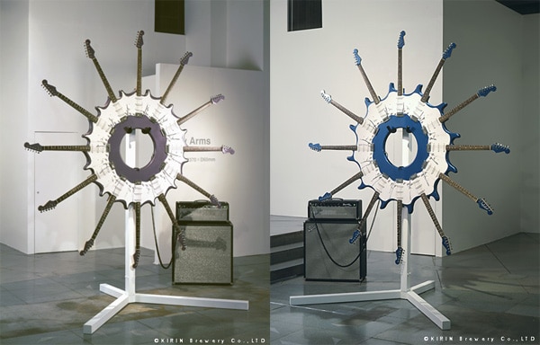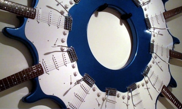 Mr. Satoh seamlessly interconnected up to 12 guitars to form a series of different yet awesome sculptures. Yes, I say awesome because even though they are destroyed forever, they make a pretty awesome display. I remember in the ’80s when rock bands started making “dual guitars” (is that what they are called?), and they started rockin’ out in badass style. I even think one band went as far as to build a guitar out of three guitars. You can never get too much awesomeness, right? Well, there should really be cowbell there, but I feel that joke has been used too much already.