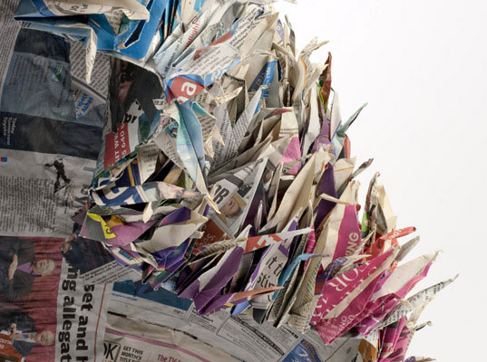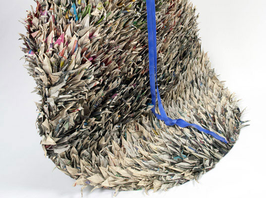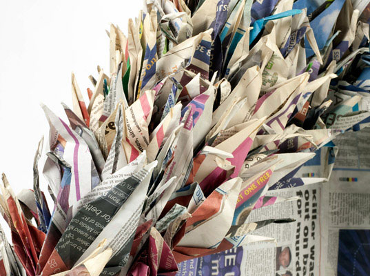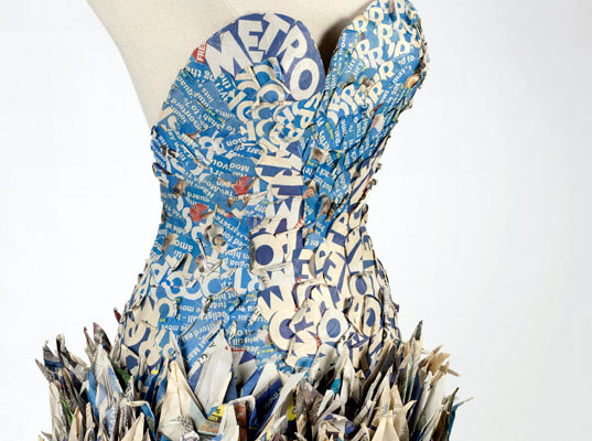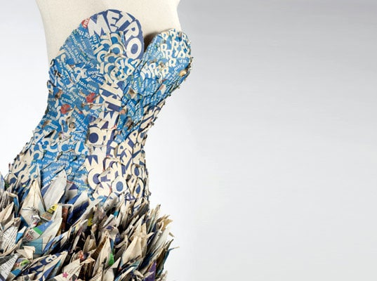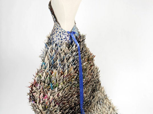 What could be more beautiful than a dress handmade from 1,000 cranes folded a’la origami style from newspapers? You’ll notice, there is even a peacock style train on the back. What a creative design! It’s nice to see something fun being made with recycled old-fashioned newspapers for a change.