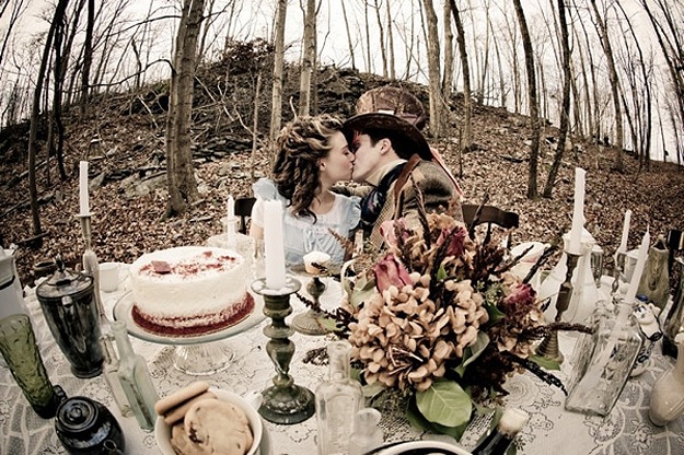 One thing I haven’t seen before is Alice in Wonderland cosplay. In this photo series, you’ll see newlyweds Erin and Matt (the Mad Hatter and Alice). They look like star-struck lovers as they had their pictures taken all over this incredible set which looks unbelievably realistic. I can’t imagine the time it took to put all this together. What a special day!