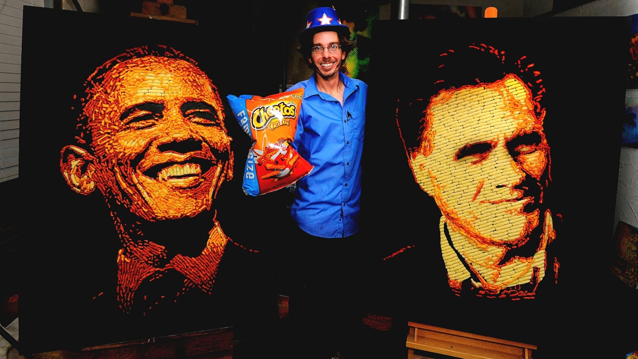 Each one of these types of Cheetos is a slightly different color, so you know what that means, right? You guessed it – It’s the perfect medium to use when creating unusual food art. Jason Baalman, who is already famous for his Cheetos portraits, unveiled his new food art which consists of both American presidential candidates recreated with Cheetos. He used all different kinds of Cheetos in order to get the shading and contrast of the colors correct. If you click on the food art pictures of Barack Obama and Mitt Romney below, you’ll see the outstanding detail in each one of these portraits.