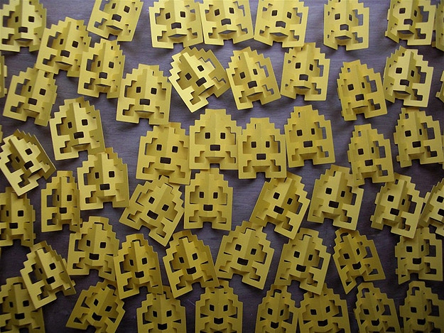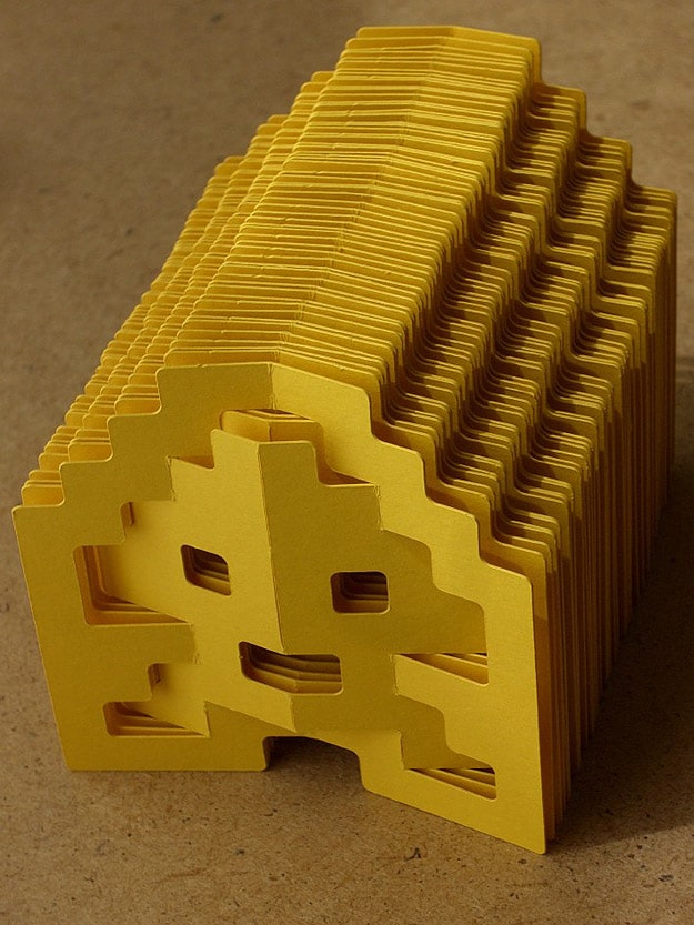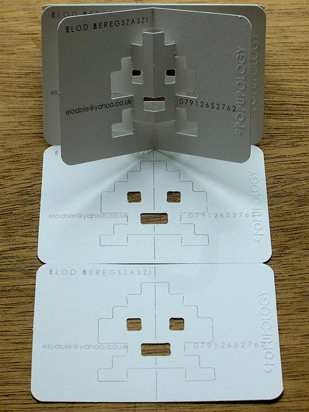 Elod Beregszaszi, an origamist, caught my attention because he adds a whole geeky spin to his incredible paper folding. His website consists of only one sentence, and a link to his flickr gallery. That sentence reads, “I am in love with paper, making it, cutting it, folding it, embossing, tearing, sculpting… you get the idea.” From the looks of his artwork below, I would have to agree with him. It’s no wonder his papercraft creations can be seen all over London. Of all his designs, some of which are shown below, I think my favorite is his Space Invaders business card. #want!! He also created this fun 14-second video, which shows how it unfolds into geeky fun.