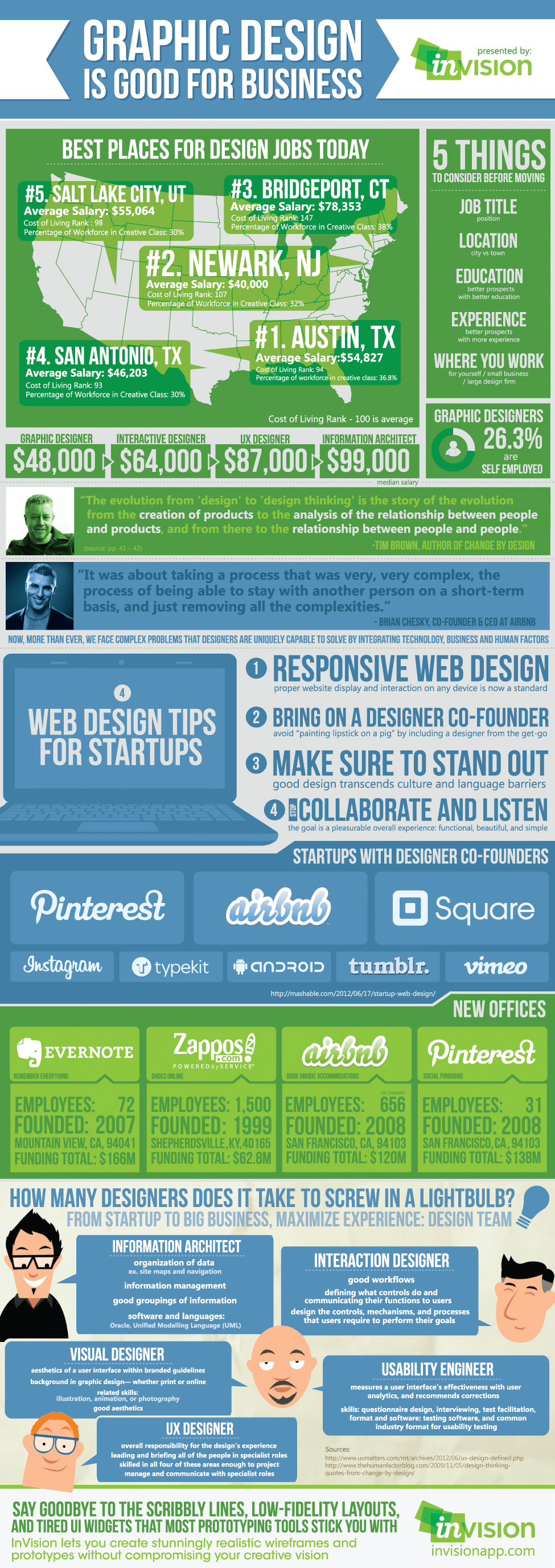 From this infographic, we will also be able to derive a clear message about where to start looking for positions that might enhance your chances of achieving success, getting a nice salary and of course the title you might be headed towards. 26.3% of all great graphic designers are self employed, which somewhat tells us that the chance of developing something new and groundbreaking within this community is quite high. If you’re looking into starting something new, make sure you bring on a great graphic designer as co-founder (if you are not one yourself), and you will know that the design end of things will at all times be met with the greatest of care.