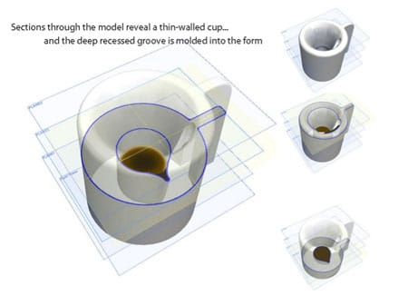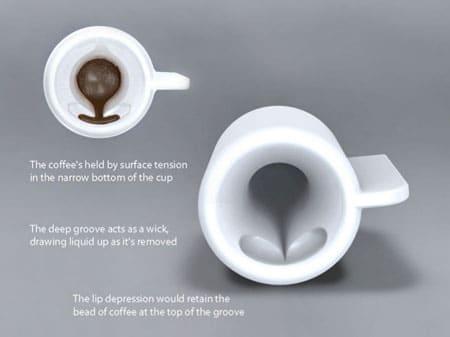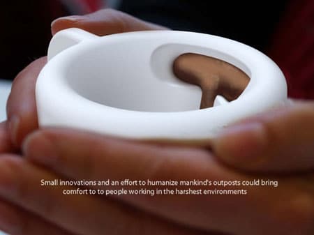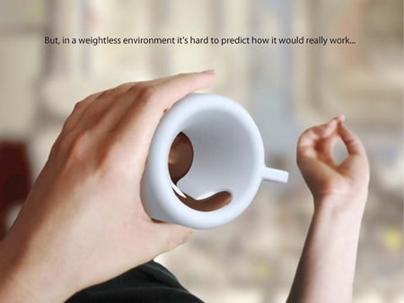 As you can see, the coffee is only held safe within the cup by the bevels and the surface tension at the bottom of the cup. Give it a little bit of forward momentum, and the coffee will come pouring down for the astronaut to enjoy. No one said drinking in space was easy, and it’s definitely not posh. This cup, meant to increase the enjoyment of a real cup of coffee in space, is easily mass manufactured, which of course means we will all soon be traveling to other planets and galaxies, no?