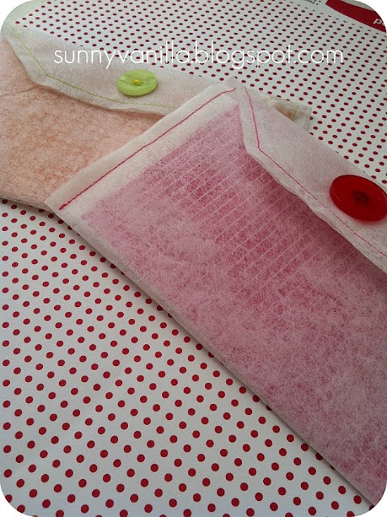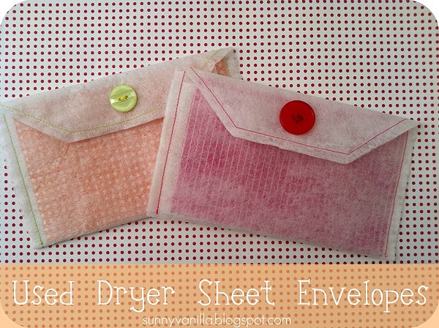 Back to repurposing used dryer sheets into something practical… Jen, the blogger behind Sunny Vanilla, recently wrote about how she created envelopes from used dryer sheets. The only materials you need for this project are the actual dryer sheets, an iron, a ruler, a marker, some buttons and some sew-in velcro. Since transparent envelopes are all the rage in the fancy paper shops, this little project is not only relevant, but also very clever. You can view the pictures below to get a feel for how she did it, or click over to Upcycle: Used Dryer Sheet Envelopes for the complete tutorial. Brilliant!