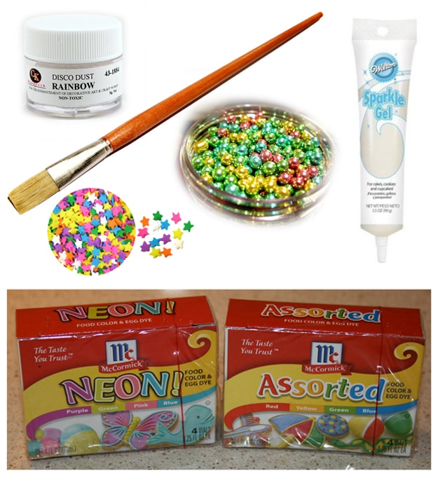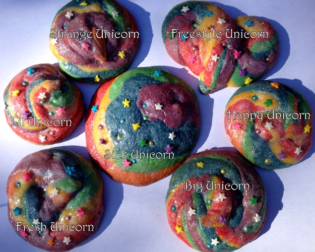 These are basically sugar cookies (with some food coloring added) decorated with rainbow dragees, rainbow star sprinkles, white sprinkle gel and rainbow disco dust. The amount of poops that you’ll get from her recipe depends on the size of the unicorn. You can check out her sugar cookie recipe and all the stuff needed to make it sparkly like a rainbow on Unicorn Poop. Nom nom!