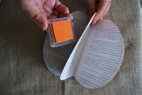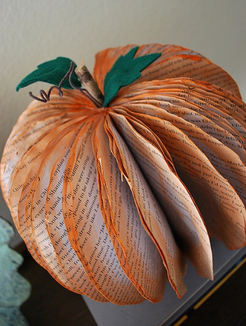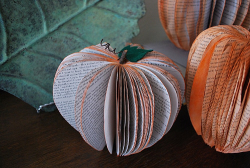 The pumpkins below were created by Jacki, the very creative and talented crafter behind Crafting Mom. She made these with some old damaged paperback books, a hot glue gun, a pair of scissors, some orange paint, a sheet of paper and couple more simple supplies. You can click over to Pumpkin Decorations Made From Recycled Books to get the detailed tutorial if you want to try this yourself. I think the most fun part would be dipping the books in the orange paint and using the hot glue gun, but then again, I always like the messiest stuff the best. If you do end up making some of these this season, I hope you come back to share some pictures with us!