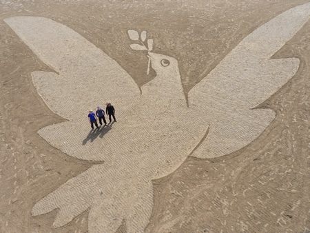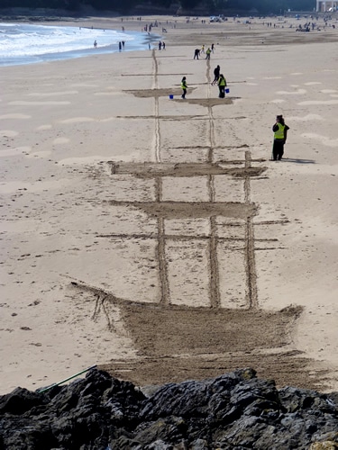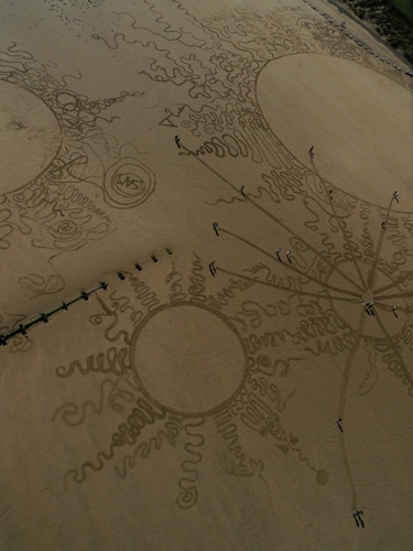 Similarly to “Mr. Snow,” the team (yes, it takes a whole team of people to make these sand art works) at Sand In Your Eye start with a sketch and a plan. However, there is a time constraint when you’re dealing with beaches…it’s called THE TIDE. All of Sand In Your Eye’s works must wait until the beach is dry and then they have to get the drawing and raking done and photographed or videoed before the tide comes in and “returns the beach to its natural state.”
