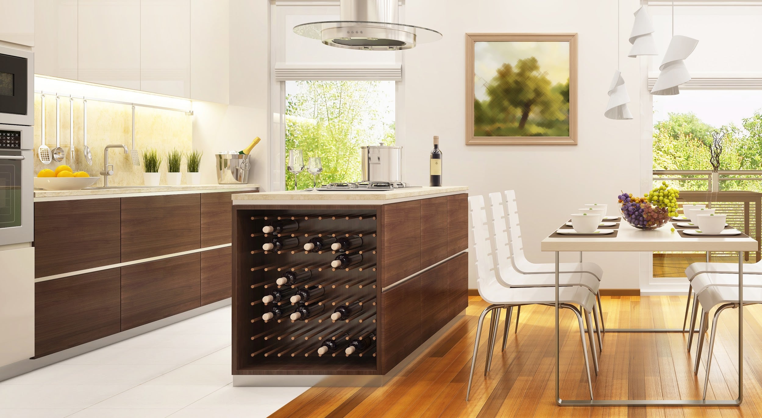The simple modification complements the sleek design of the rest of the kitchen and is located just inches from the dining table. This kitchen island offers up the perfect place to store bottles while boasting an attractive design in what is otherwise a simply decorated kitchen.