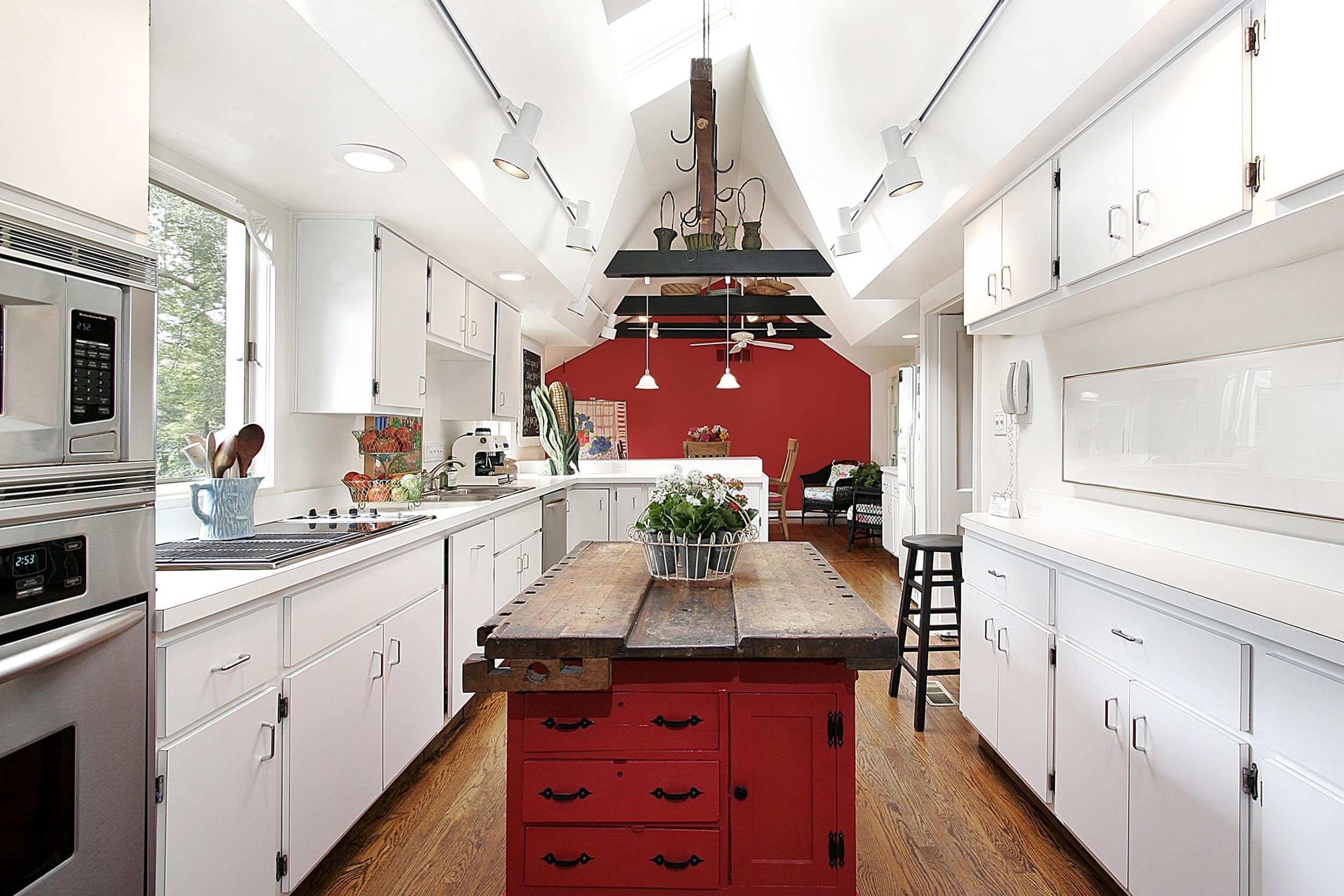 Like the previous kitchen we looked at, this one boasts a deep red shade. However, this is where the similarities end. Adopting a traditional rectangular shape, this kitchen offers a wonderful combination of modern and traditional. Sleek modern cupboards and furniture deck the sides, while exposed beams and a rustic kitchen island sit in the center.