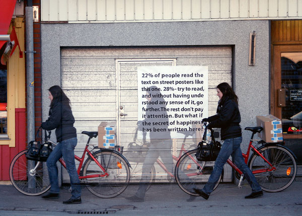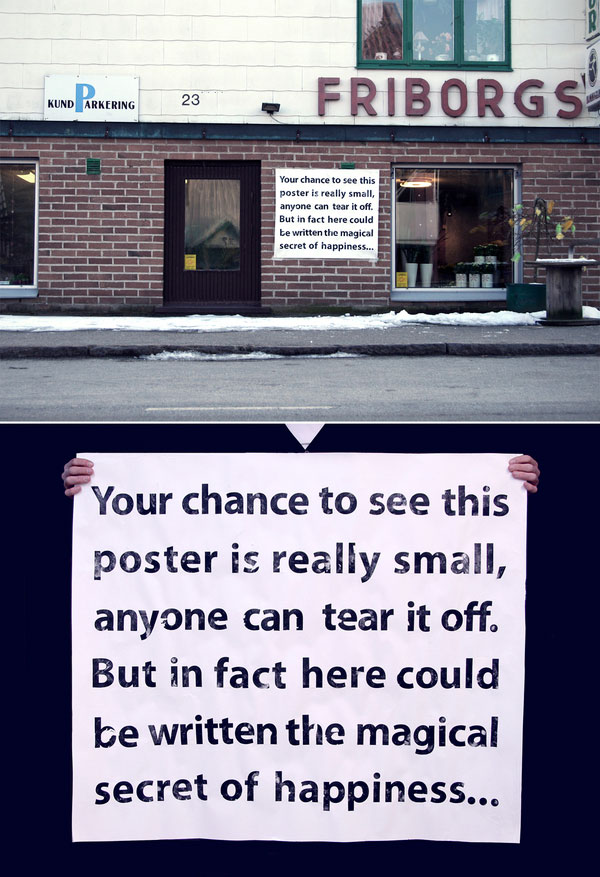 What is the secret to happiness? I guess the answer to this question would depend on who you ask. Happiness means different things to different people, but in the end, I think we all just want to feel alive and full of joy. I am inspired by any type of interactive design because it brings people together and makes them think. This very cool poster art, entitled “Public Poster Project” was the manifestation of three friends who wanted to encourage people in their town to think about happiness and what it means to them.