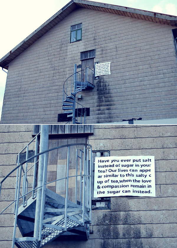 According to https://keepinspiring.me, it is “a collaboration between three gifted photographers; Egor Bashakov, Karina Eibatova and The Dopludo Collective named ‘Public Poster Project.’ It has provoked thoughts amongst the finest of philosophers.” I’ve read in some places that this took place in Bohuslän, Sweden (on the Swedish west coast) and I’ve also read that it was here in the States in Oregon (although it doesn’t look like it is in the States). Either way, the people in their town were touched deeply by these messages because this happened over a year ago and a half ago and it’s still causing quite a buzz.