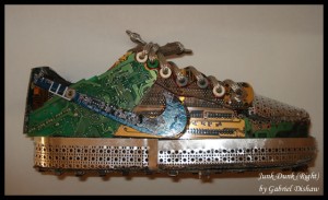 What is Junk Art? Junk Art is a three-dimensional art made from discarded material (as metal, mortar, glass, or wood). The artist truly takes time in re creating the wonderful work of art. He puts together computer parts, bolts, metal, wire etc. I believe his favorite art to work on is the classic rubber shoes. He painstakenly recreated a pair of Nike’s.