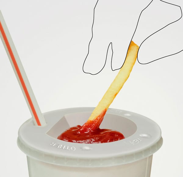 Designers Bae Su-kyoo and Noh Haeun have come up with a brilliant little design that will take care of this without creating any more waste. By simply making a small modification to the already existing drink lid, they make what they call a dipping cover which is a little dipping well where you can squirt the ketchup without any mess or inconvenience. You can even eat ketchup on the go now, which as you know, in the past has been a big challenge. Some fast food restaurants have little paper cups specifically for ketchup, and this design would completely eliminate the need for those. Chances are, this won’t become a reality, but I sure wish it would! I think it’s a great idea.