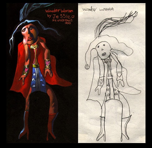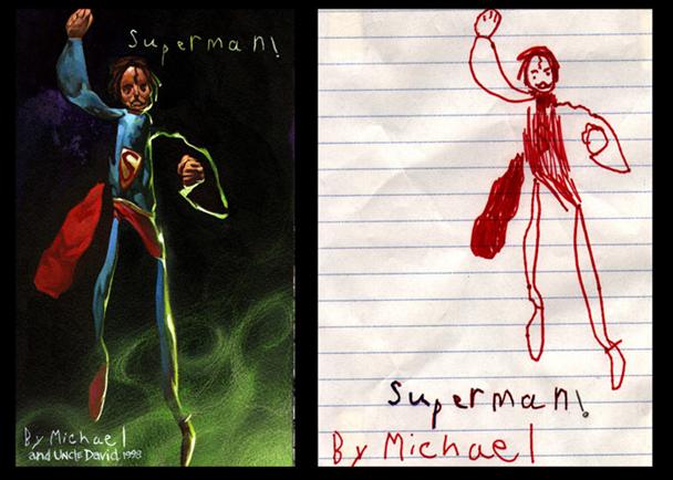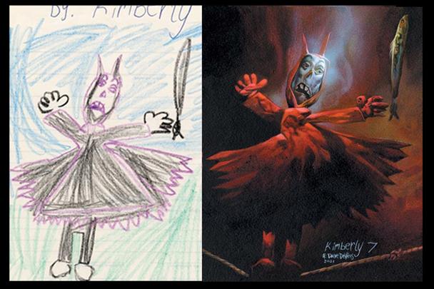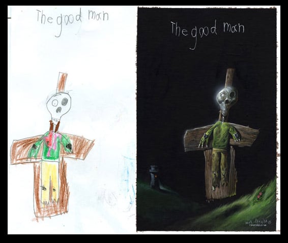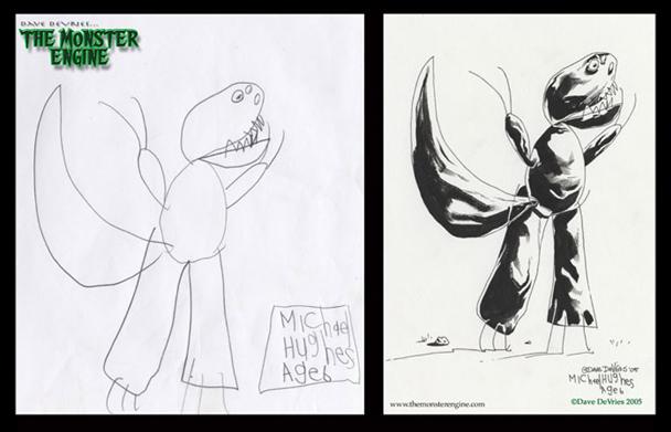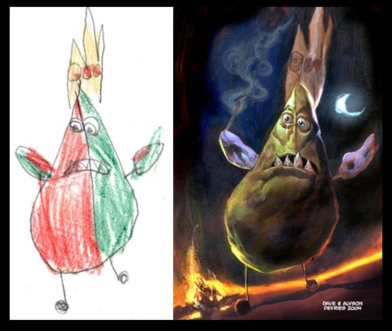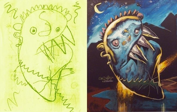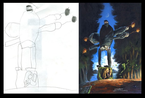 However, now we get an exclusive look into what a kid’s imagination really looks like. Painter David Devries has been interpreting kids’ drawings since back in 1998. And let me tell you, some of these drawings are just flippin awesome, and if I were a kid today with these kind of dreams and drawings, I would scare myself into never using a crayon ever again.