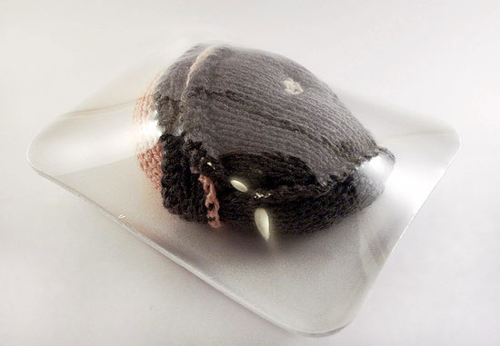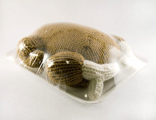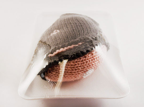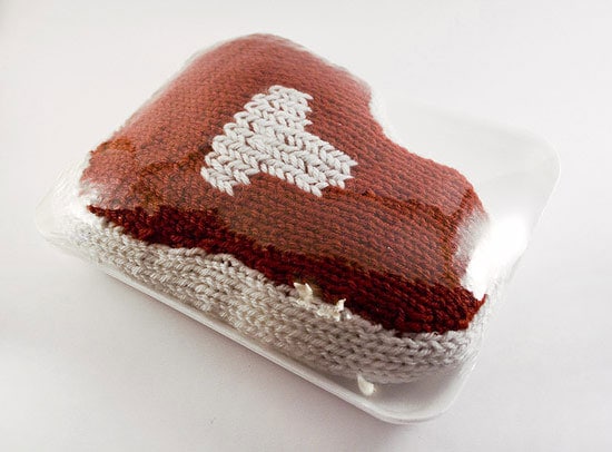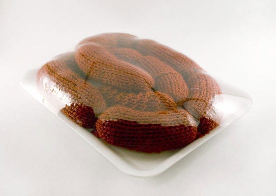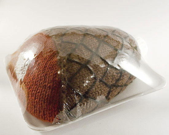 What can rival the kind of creative insanity (or genius) required to embroider bread? Knitting slabs of meat and wrapping them up like the butcher, of course!