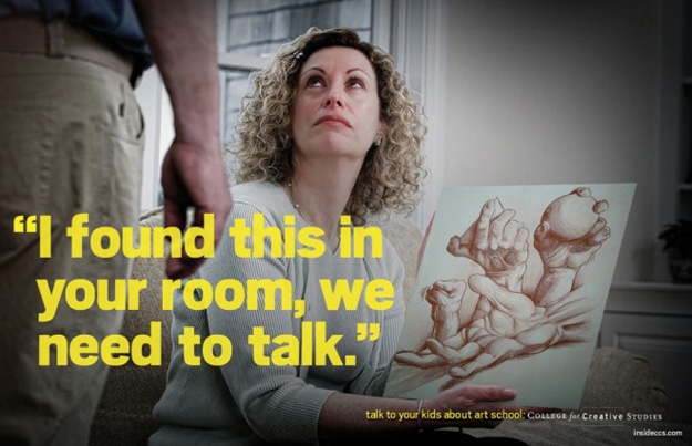 The very fun people over at Team Detroit recently created this ad campaign for the College for Creative Studies in Michigan. They basically spoofed the traditional anti-drug ads we are all used to seeing. In these very funny ads, they paid attention to every detail. Even in the lower right corner where it usually reads, “talk to your kids about drugs” it reads “talk to your kids about art school.” The campaign, called “Know the Warning Signs of Art” is so well done, and they even make me want to click over to the college website to see what it’s all about. I would love to know exactly how they came up with this idea. Brilliant!