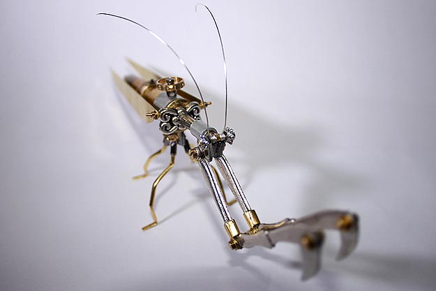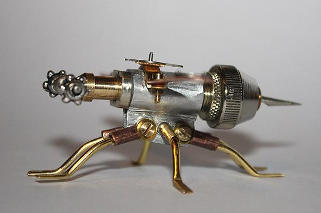 These steampunk bugs are part of artist Tom Hardwidge‘s Arthrobots collection. He began creating these just a few months ago in his dining room, and the process is fascinating. According to Arthrobots, “Each Arthrobot starts its life as a series of sketches, some take their inspiration from nature, others from bits and pieces of recycled metal and beads…”