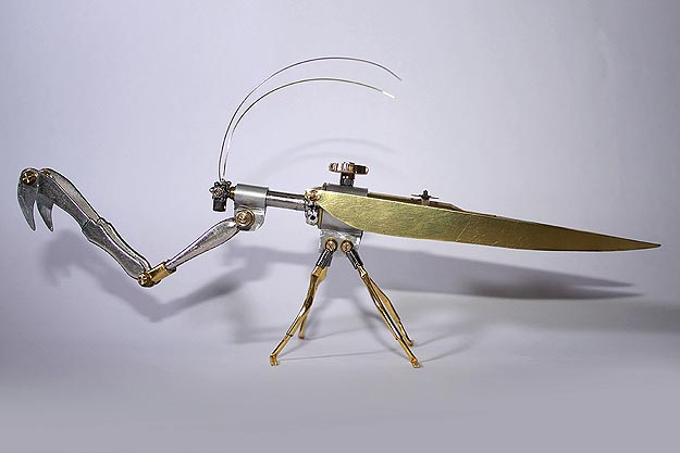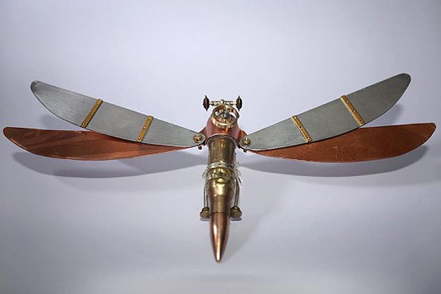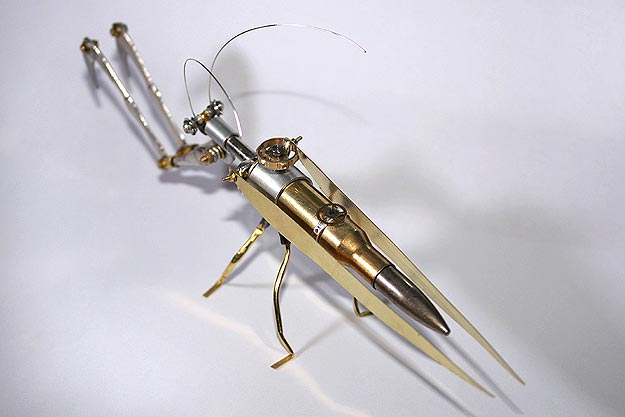 Almost all traditional steampunk creations somehow incorporate old, detailed pocket watch parts like brass springs, gears or tiny bolts. Tom uses these in his designs, which make them even more interesting. I think it’s really creative how he categorizes these insects on his site according the their phylum, class and order. It’s like taking a walk back in time to my high school biology class. The detail on these is incredible. Tom obviously has a gift. It’s very inspiring!
