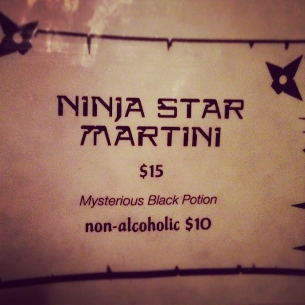 I like to sample theme cocktails, so I ordered the Ninja Star Martini, the restaurant’s signature drink. It had no listed ingredients. The menu simply called it a “mysterious black potion.” The yummy dark elixir came in an elegant martini glass with a throwing star doubling as a straw and garnish. As we began to get a little tipsy, ninja magicians circulated doing magic card tricks. Throughout the meal, we listened as the dimly lit dining hallways were filled with the screams of the new patrons who were entering the village and being “greeted” by jumping ninjas. On our way out, we even got a ninja escort to see us off with a sudden “hai-YA!” as he dropped a slick “Sayonara” scroll before the elevator doors slammed shut.