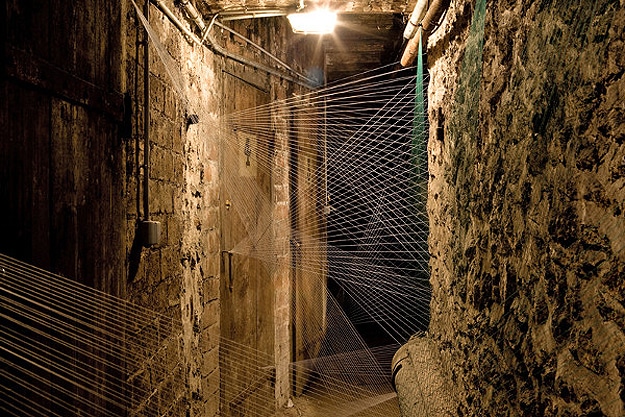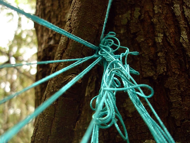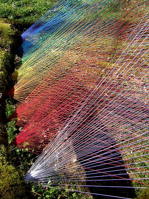 According to an interview on Trendland, Sebastien likes working outside because, “no one disturbs you, you take the time you want, the time you need.” He uses thread to create these lines and to create graphics in places where there were none before.