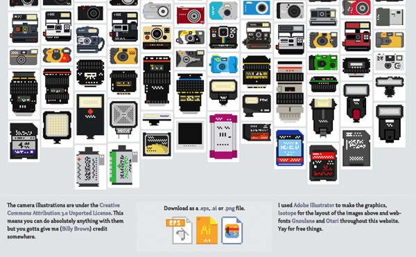 Bill created a collection of 100 pixelated camera illustrations for anybody to download and use in whatever way they want. According to his website, he used Adobe Illustrator to make the graphics and Isotope for the layout of the images. But that’s not all…