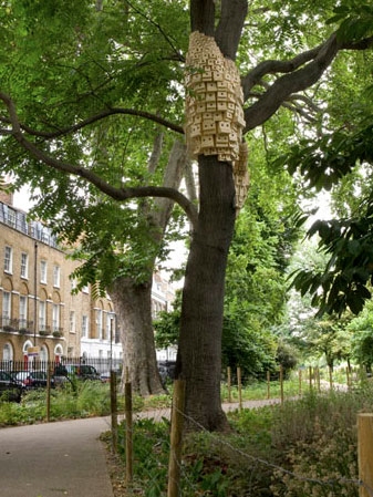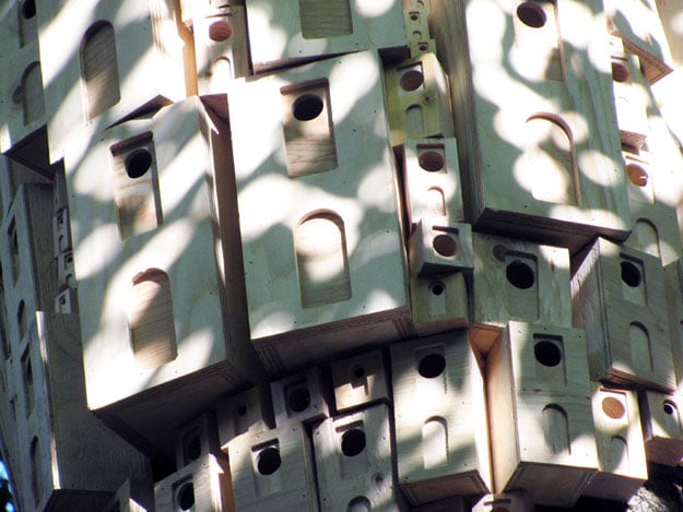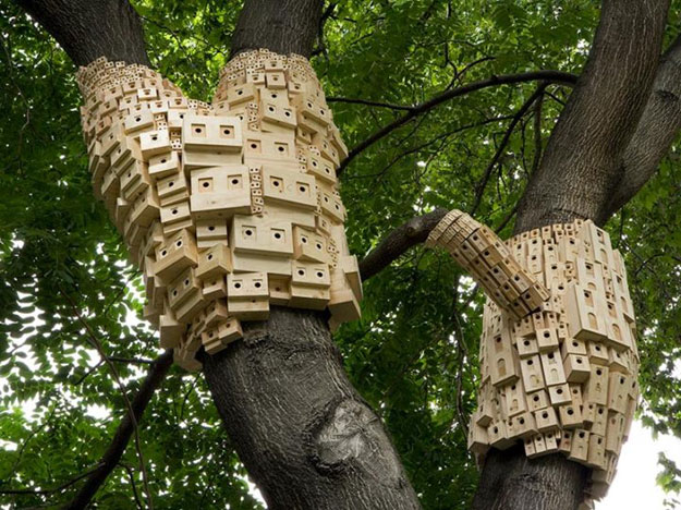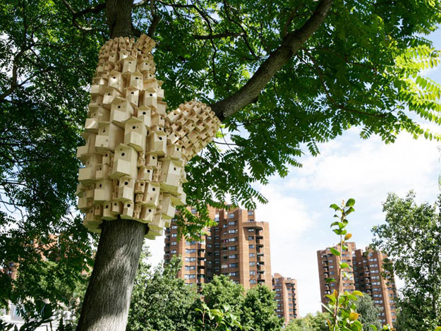 The London artists at London Fieldworks created this bird neighborhood called the “Spontaneous City in the Tree of Heaven.” It consists of over 250 bird boxes in different shapes and sizes to please even the most discriminating birds. These organic forms will change shape to accommodate the tree as it grows. It’s all done to raise awareness about how important urban green spaces truly are. Wow, I would love to have one of these structures in my front yard. It’s like a 5 star bird hotel!
