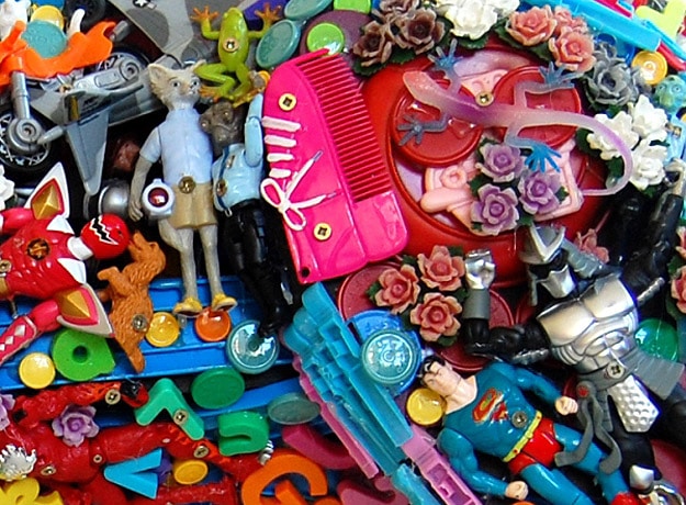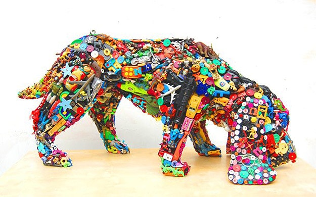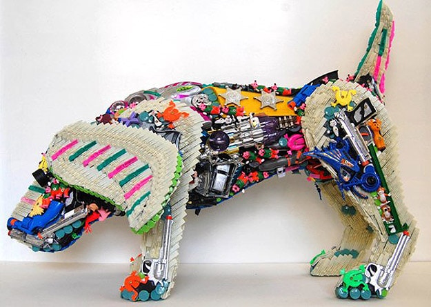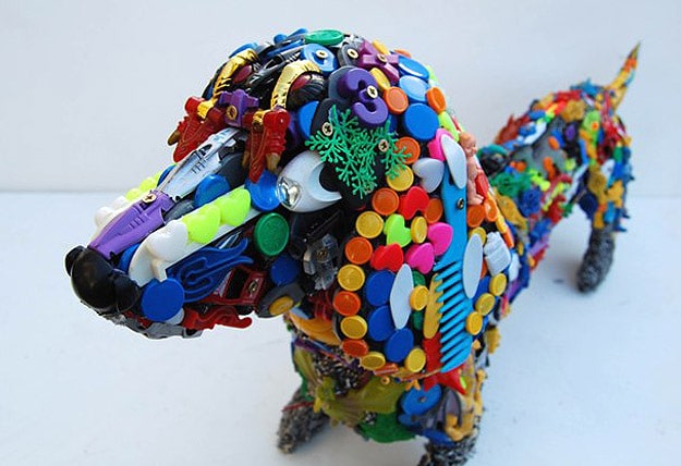 Since we can’t really give those small things to charity, what do we do with them? Artist Robert Bradford had a great idea to solve this dilemma in his house. He recycles old plastic small toys into very interesting dog sculptures.