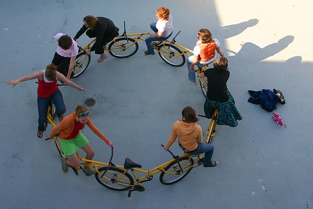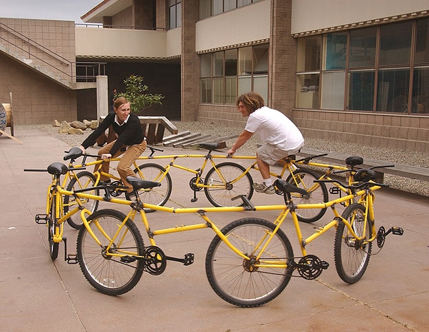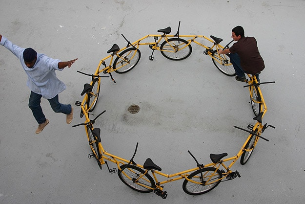 This bicycle carousel is by far my favorite one of his designs. He created this by recycling nine old bikes. The only materials he used were the bicycles themselves, some tube steel to attach them to each other and some yellow paint. Just so you can get an idea of the size, it stands three feet tall and is twelve feet in diameter. This carousel (kinda like a merry-go-round for adults) can be easily taken down and put back together, so it can be moved from place to place. Robert envisions this being in a public place, like in front of an office building or in a park, where people everywhere can join in the fun! I wish we had one of these in Atlanta, I would ride it all the time. Props!