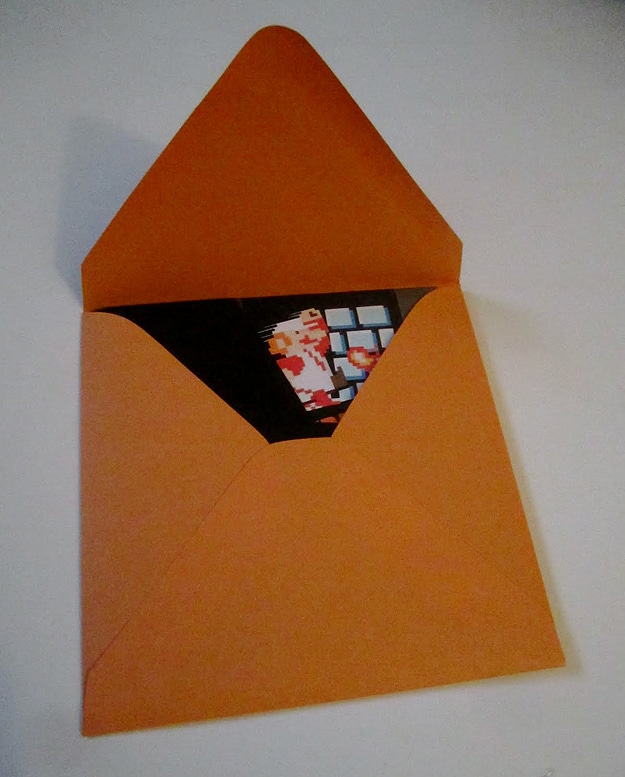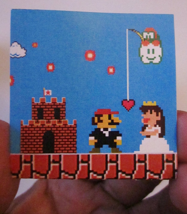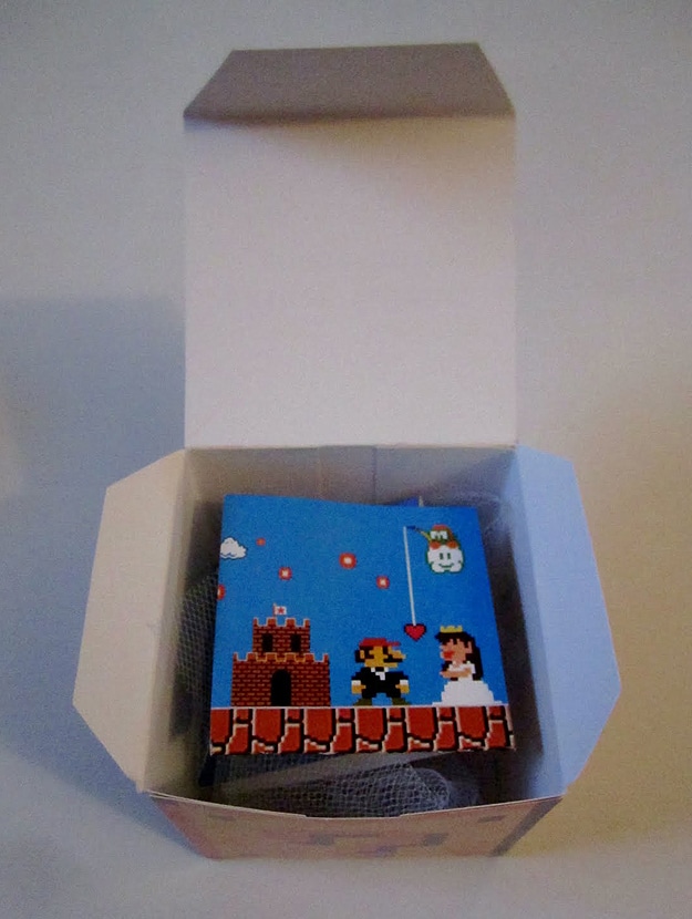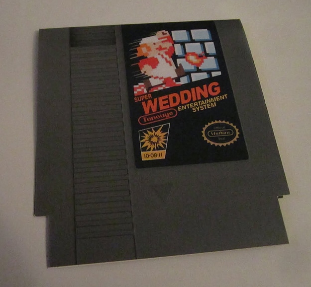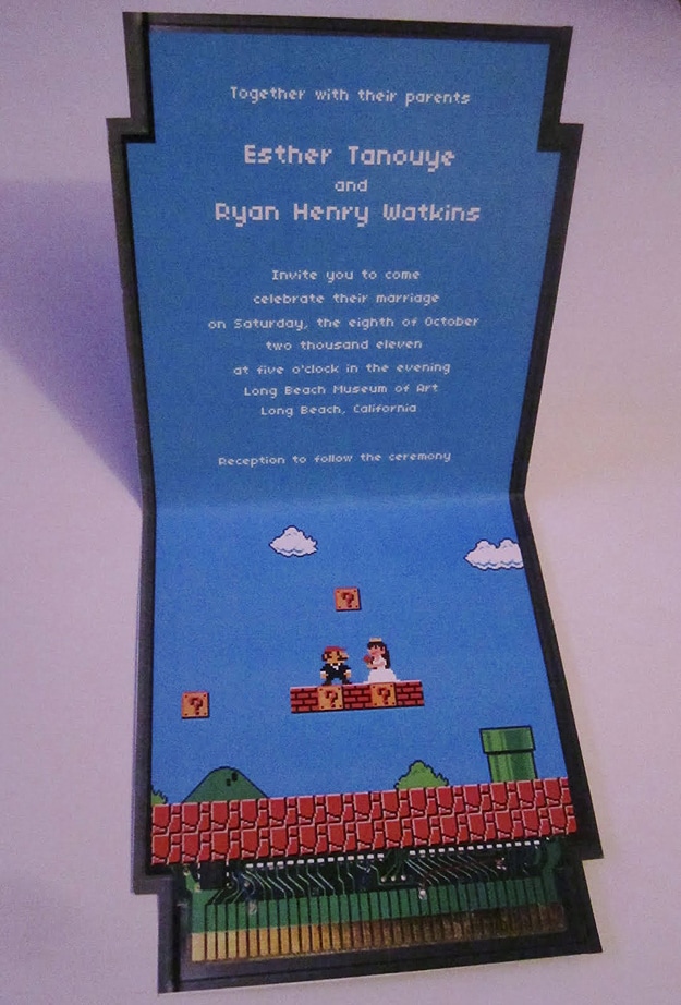 Another fun couple who also loves Super Mario Bros is Ryan Watkins and his new wife Esther. They decided to have an 8-bit Super Mario themed wedding, and all I can say is holy crap, this is ultimately cool. Not only did they send out these game cartridge invitations in a neat little envelope, they open up into a totally cute retro-looking invitation.