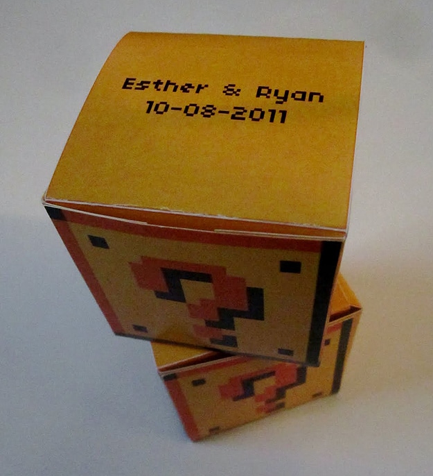 They also had matching wedding favors for all their guests, like this box you see below which opens up to a thank you card and Super Mario chocolate coins. Everything was handmade (except the chocolate coins) by Larry T. Quach and a couple helpers. I don’t know how anyone else who has a Super Mario Bros themed wedding could ever top this. I mean, the only thing more fantastic you could do, as one reddit commenter said, is to send out an actual game that people have to beat in order to find out the wedding location or something. Even the seating chart and place cards at the reception were Super Mario Bros themed. These pictures really don’t do it justice; just click over to Larry’s blog to see a ton more pictures and to read more about this touching story of geek love.