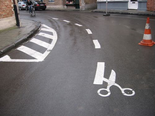 There are so many different forms of street art. There is graffiti artwork, stencil graffiti, sticker art, wheat pasting, street poster art, video projection, art intervention, guerrilla art, flash mobbing and street installations. I found a cool site that showcases fascinating and really amazing street or road art created by Peter Gibson aka Roadsworth. His works are remarkable, but like many street artists, he has gotten into trouble because of his work.