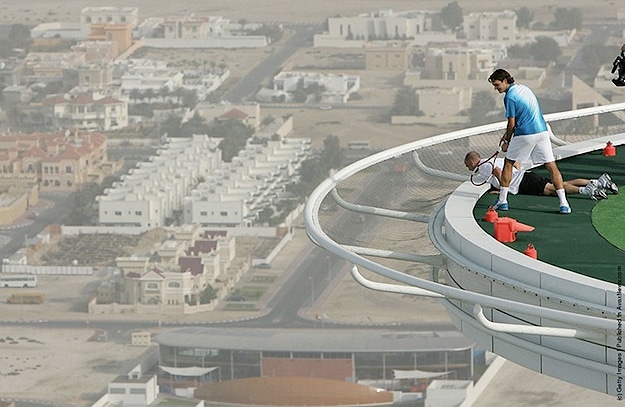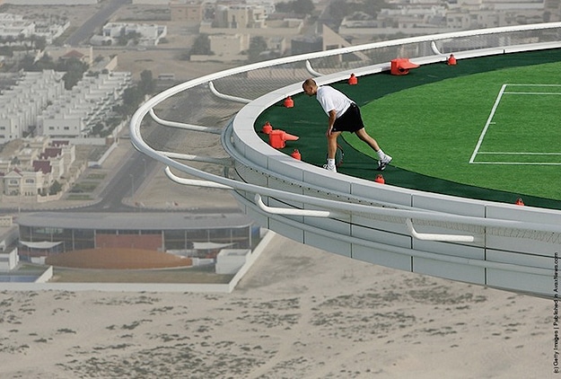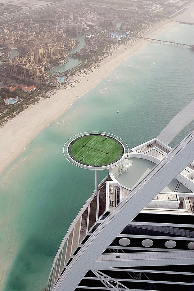 The design I want to share with you today is truly mind-boggling. I have never seen anything like this before. This is the world’s highest tennis court, which happens to be at the world’s most luxurious hotel. It’s a seven star place to stay. I didn’t even know the scale went up to seven stars. There is a small wire mesh which keeps people who play tennis here from falling over the edge. Hmm…