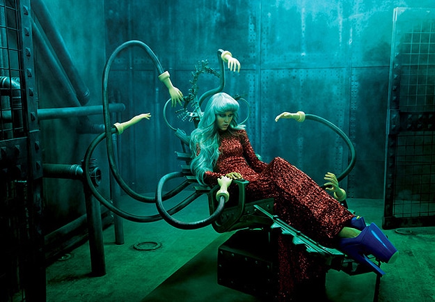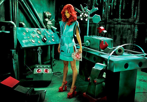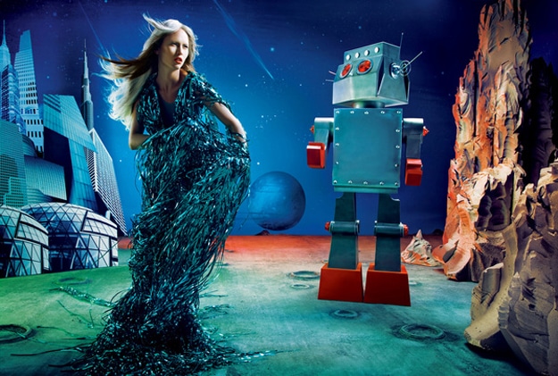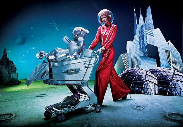 Maybe instead of that, they think we’ll all be part-robot (assimilation) then anyway, and since being fashion conscious is a human trait, we won’t have that anymore. Photoshop retouch master and photographer Tejal Patni, from Dubai, created his own spin on what he thinks fashion will entail in the future. In his futuristic world, fashion is still colorful, stylish and fun. That’s what I’m talkin about! I love the shoes, and the dress that looks like it’s made out of Christmas tree tinsel is my favorite. Very nice Tejal!