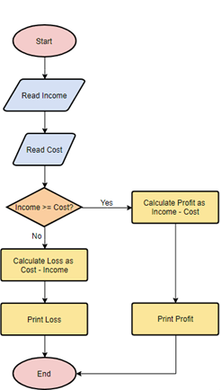 Also known as the activity/step/process symbol, this symbol is used to indicate when a process is going on or when an action needs to be performed. For example, in the terminator case study above, you’ll notice there’s a rectangle-shaped symbol just below the diamond stating that the reader should “calculate Loss as Cost – Income.”